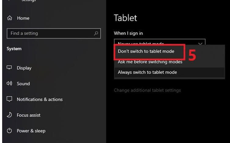 Tại mục When I use this device as a tablet, chọn Don’t switch to tablet mode (Không chuyển sang chế độ máy tính bảng).