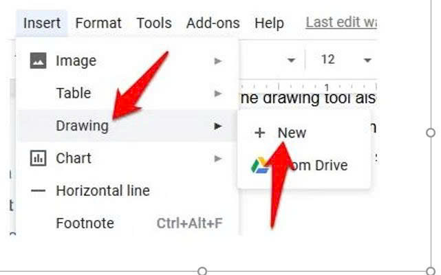 Tạo một tài liệu Google Docs mới, nhấp vào Insert > Drawing, sau đó click vào New để tạo text box.